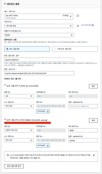방화벽(보안 그룹)의 인바운드 설정에는 기본적으로는 22 포트에 대한 설정만 있습니다.