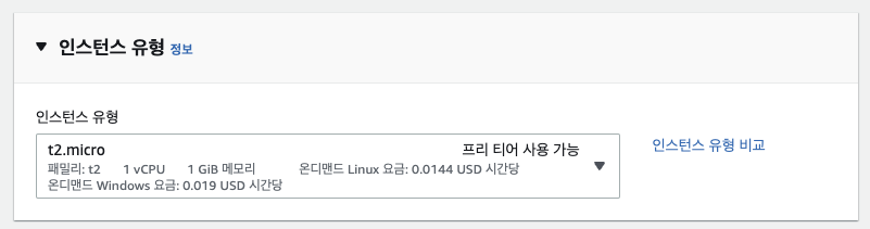 현재 프리티어가 사용 가능한 인스턴스 유형으로는 t2.micro만 가능합니다.