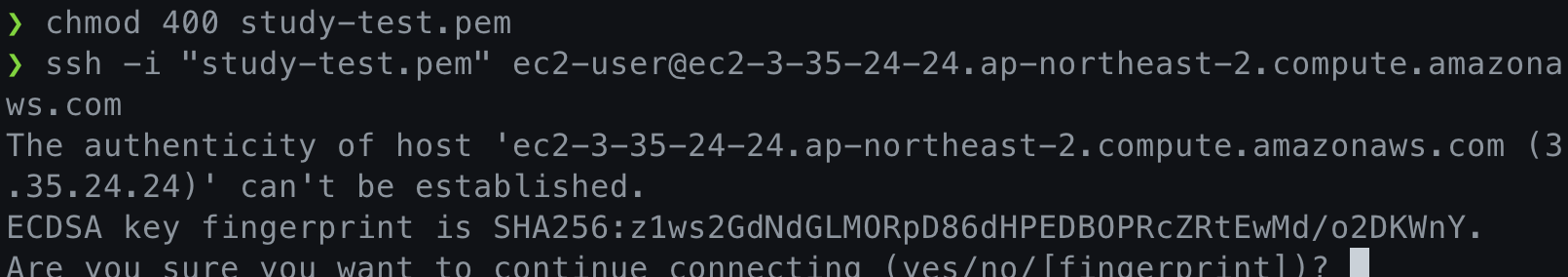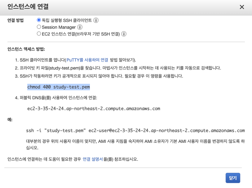 ssh -i "study-test.pem" ec2-user@ec2-3-35-24-24.ap-northeast-2.compute.amazonaws.com