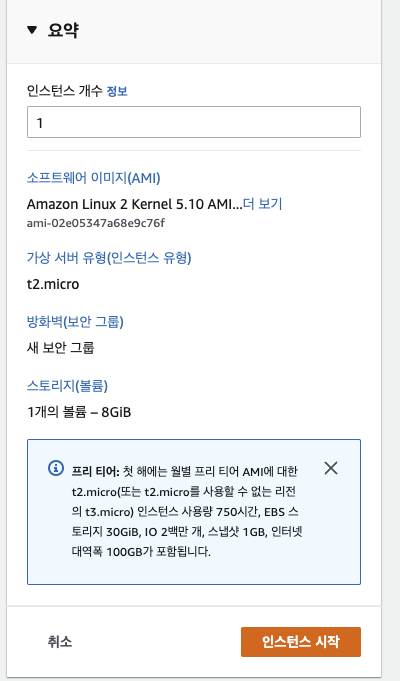 요약 화면에는 인스턴스 개수, AMI, 인스턴스 유형, 방화벽, 스토리지 등에 대한 정보가 있습니다.