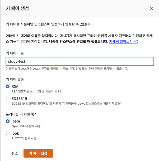 맥에서는 ssh로 ec2에 접근할 거기 때문에 pem 파일 형식을 선택합니다.