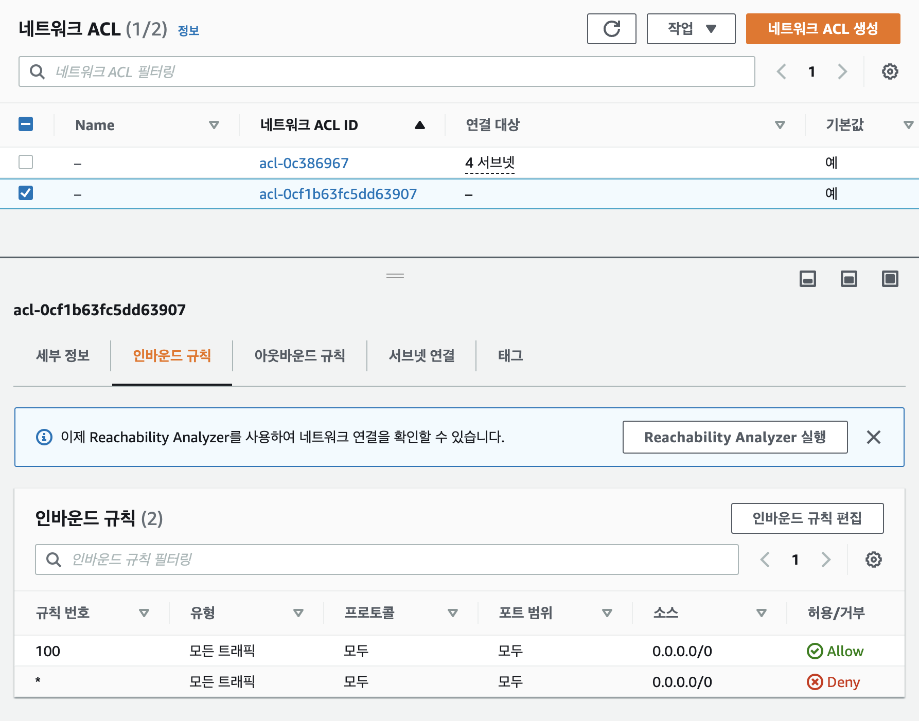 서브넷 목록에서 2개의 서브넷이 만들어진 것을 확인할 수 있습니다. 서브넷의 상세 내용을 확인해보면 앞서 VPC와 함께 만들어진 네트워크 ACL과 라우트 테이블이 함께 지정되어있는 것을 확인할 수 있습니다.