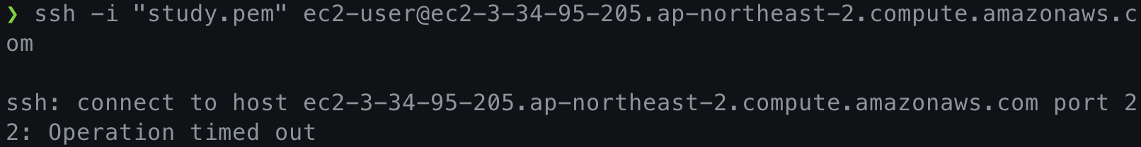 ssh로 인스턴스에 연결을 시도하면 연결이 안 되고 다음처럼 타임 아웃 에러가 발생합니다.