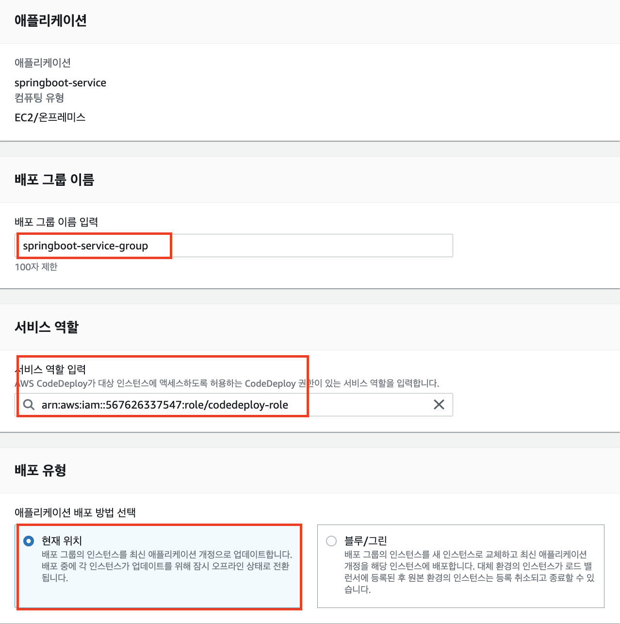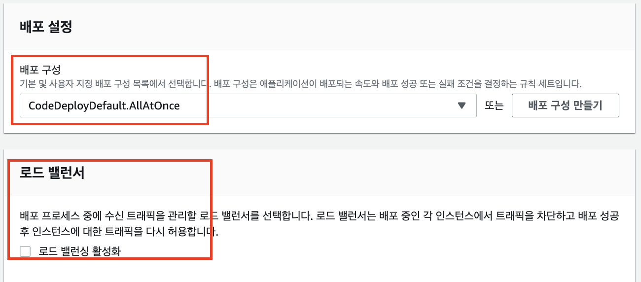 현재 프로젝트의 경우 EC2 하나만 배포하면 되므로 배포 유형- 현재 위치, 로드 밸랜서- 비활성화 설정을 해두었습니다.