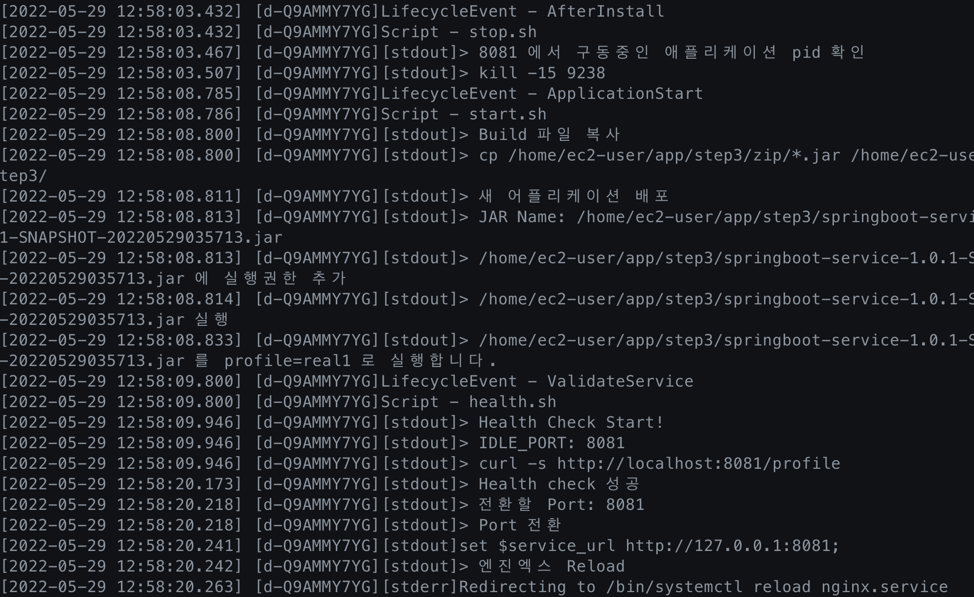 $ vim /opt/codedeploy-agent/deployment-root/deployment-logs/codedeploy-agent-deployments.log #CodeDeploy 로그