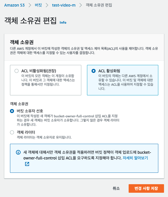 다음과 같이 ACL을 활성화하게 버킷의 '객체 소유권'을 수정해줍니다.
