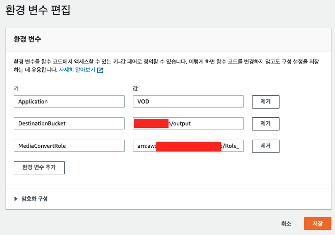 MediaConvertRole = [위에서 등록한 Role_MediaConvert의 ARN]