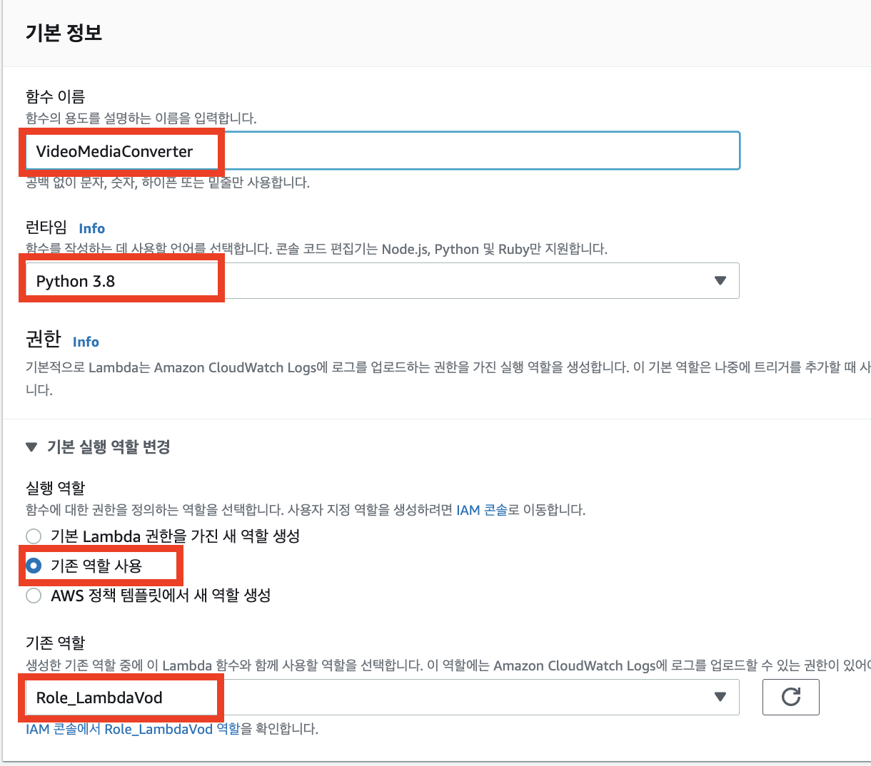 이름을 등록하고 실행 역할은 위에서 만든 Role_LambdaVod를 등록한 후 함수를 생성합니다.