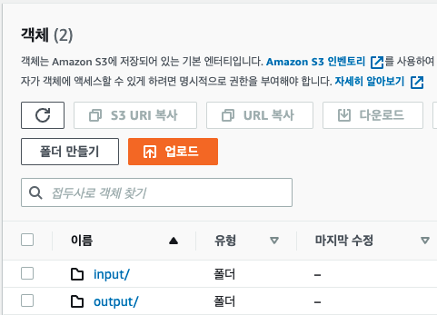 버킷의 안에 다음과 같이 input과 output 폴더를 생성합니다.