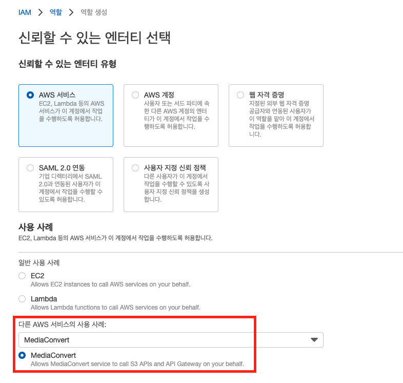 먼저 MediaConvert를 사용하기 위한 역할을 만들겠습니다.