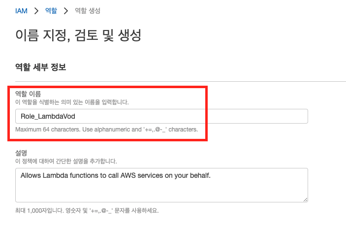 이름은 Role_LambdaVod로 설정했고 역할을 생성합니다.
