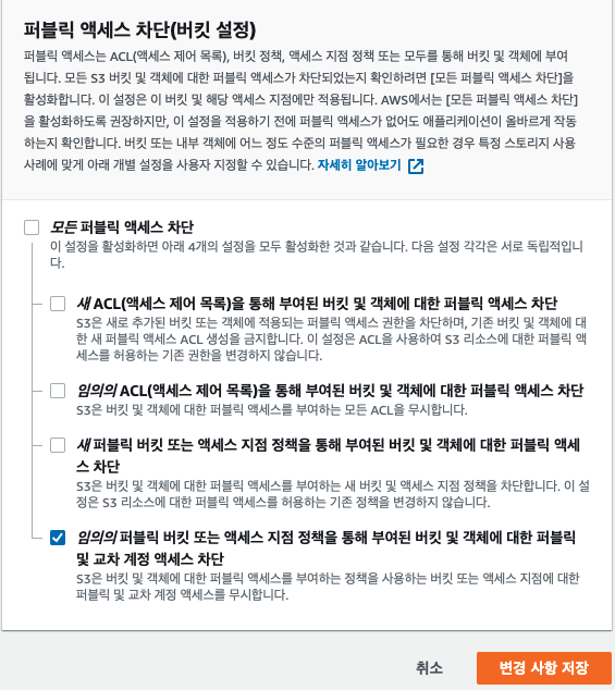 먼저 퍼블릭 엑세스 차단에 가서 4번째인 '임의의 퍼블릭 버킷 또는 액세스 지점 정책을 통해 부여된 버킷 및 객체에 대한 퍼블릭 및 교차 계정 액세스 차단'을 제외하고 체크를 해제합니다.