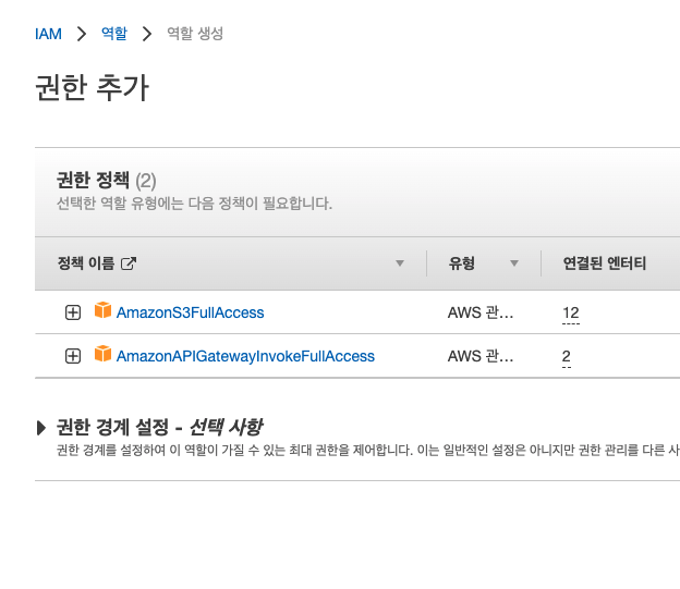 권한은 다음과 같이 S3FullAccess와 APIGatewayFullAccess 두 개가 추가된 것을 확인할 수 있습니다.