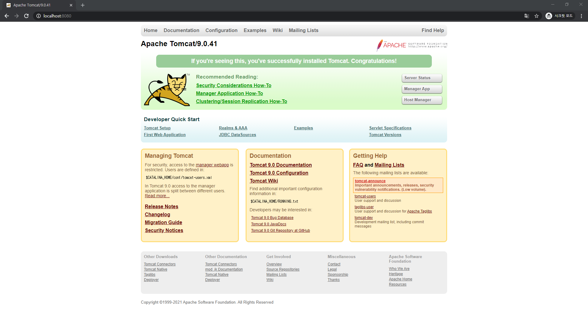 톰캣 9에서 가장 최신 버전은 9.0.41인 것을 확인할 수 있습니다.