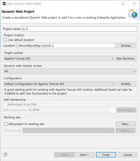 - 중요한 것은 Tartget runtime에 tomcat을 설정해야 합니다.