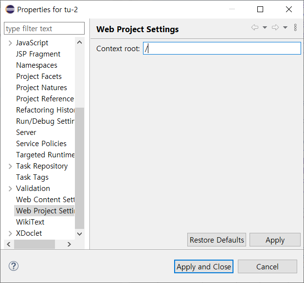 이클립스 내 Project Explorer에서 프로젝트 우클릭 > properties > Web Context Settings를 클릭합니다.