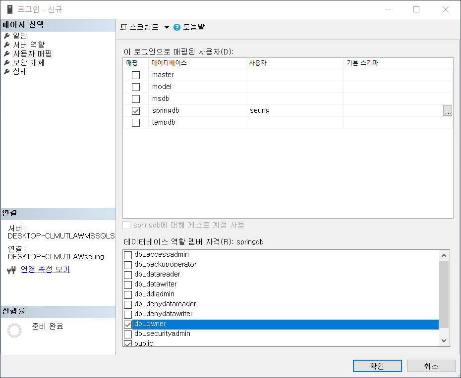 사용자 매핑 페이지로 이동한 뒤 springdb와 db_owner를 선택하십시오.