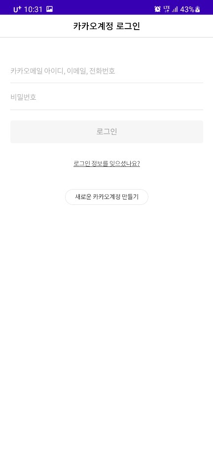 로그인 버튼 클릭 시 카카로 로그인 웹페이지에 해당하는 웹뷰가 나타납니다.