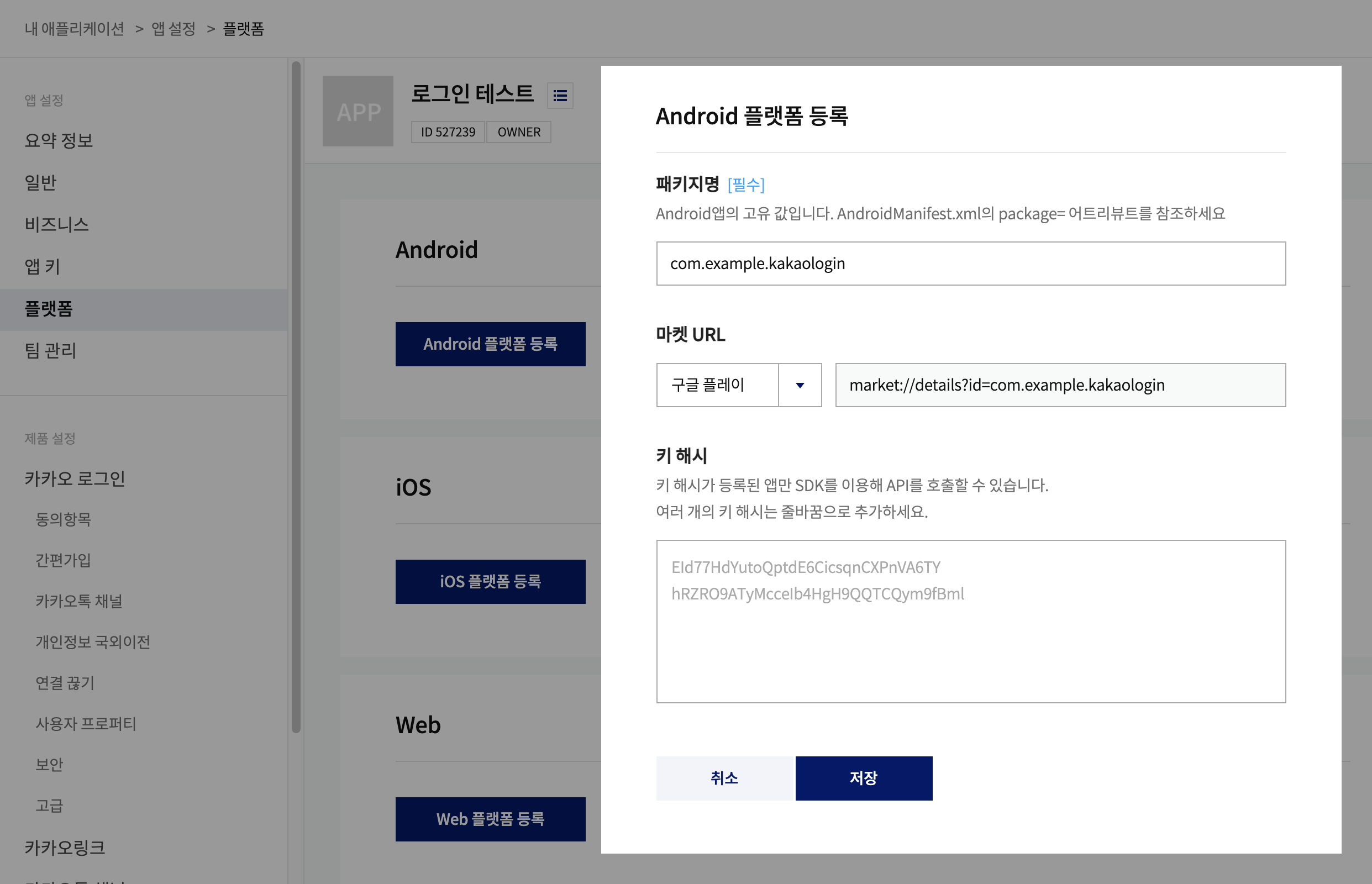 다음으로 앱의 패키지 명과 해시 키를 등록해야 합니다.