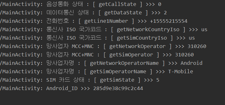 이제 TelephonyManager에서 제공하고 있는 함수들을 이용하여 원하는 데이터를 가져오면 됩니다.
