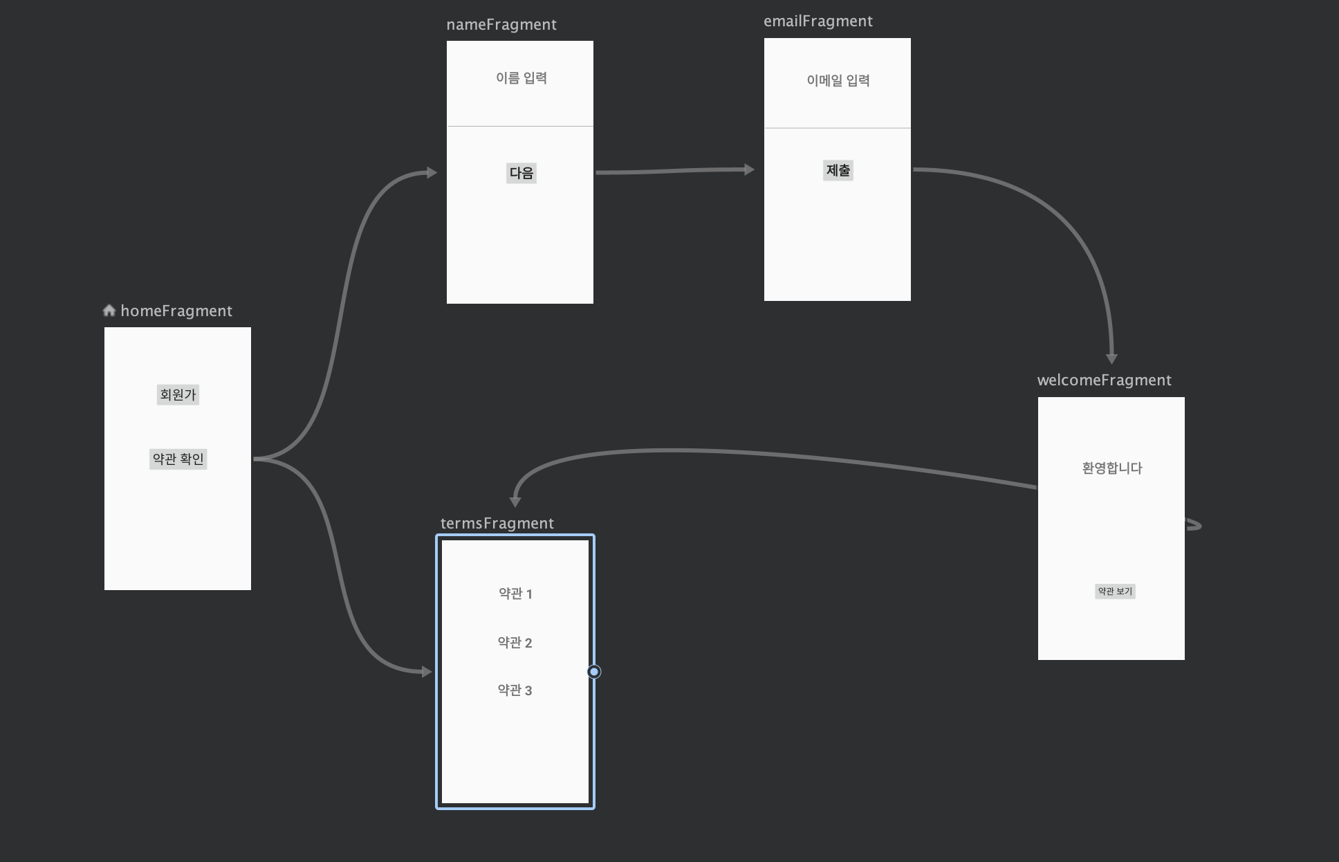 총 5개의 Fragment를 이동할 것이며 이름, 이메일 문자열을 데이터로 전송할 것입니다.