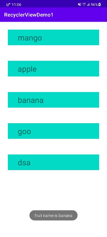 과일 이름 리스트를 보여주고, 텍스트 뷰 하나만 있는 매우 심플한 Recyclerview입니다.