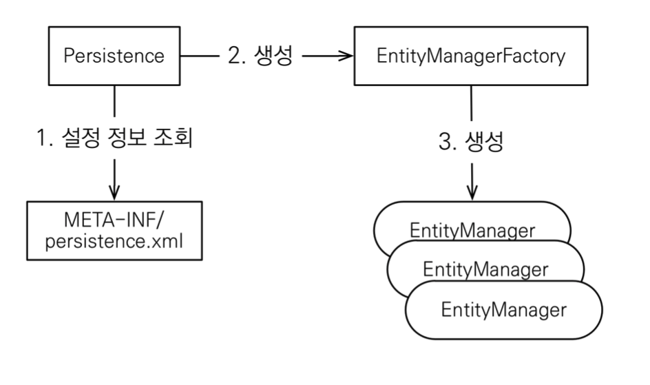 JPA를 시작하려면 우선 persistence.xml의 설정 정보를 보고 엔티티 매니저 팩토리를 생성해야 합니다. 이때 Persistence 클래스를 사용하는데 이 클래스는 엔티티 매니저 팩토리를 생성하여 JPA를 사용할 수 있게 해 줍니다.